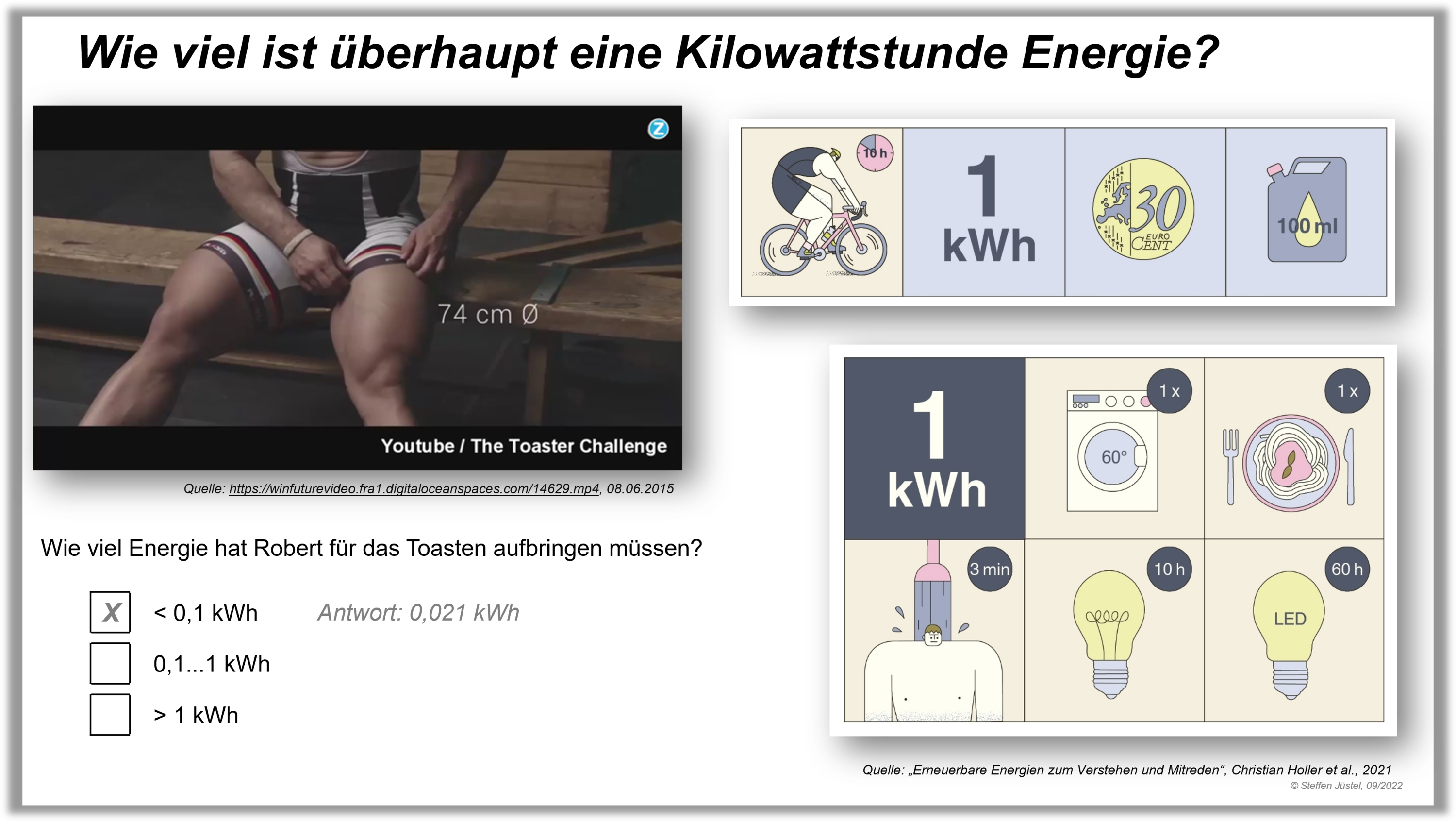 In der folgenden Grafik wird darüber hinaus auch deutlich, was wir mit einer Kilowattstunde Energie anstellen können. Zum Beispiel 3 min duschen, oder 1 mal Wäsche waschen, oder 1 mal essen, etc...